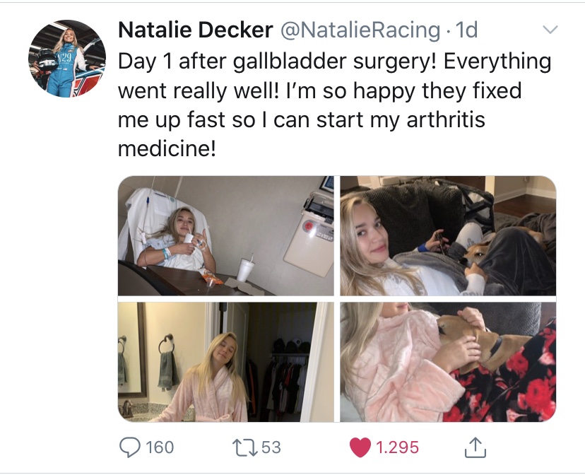 Natalie Decker, coureur van de Gander RV & Outdoors Truck-serie, herstelt na een operatie om haar galblaas te laten verwijderen.